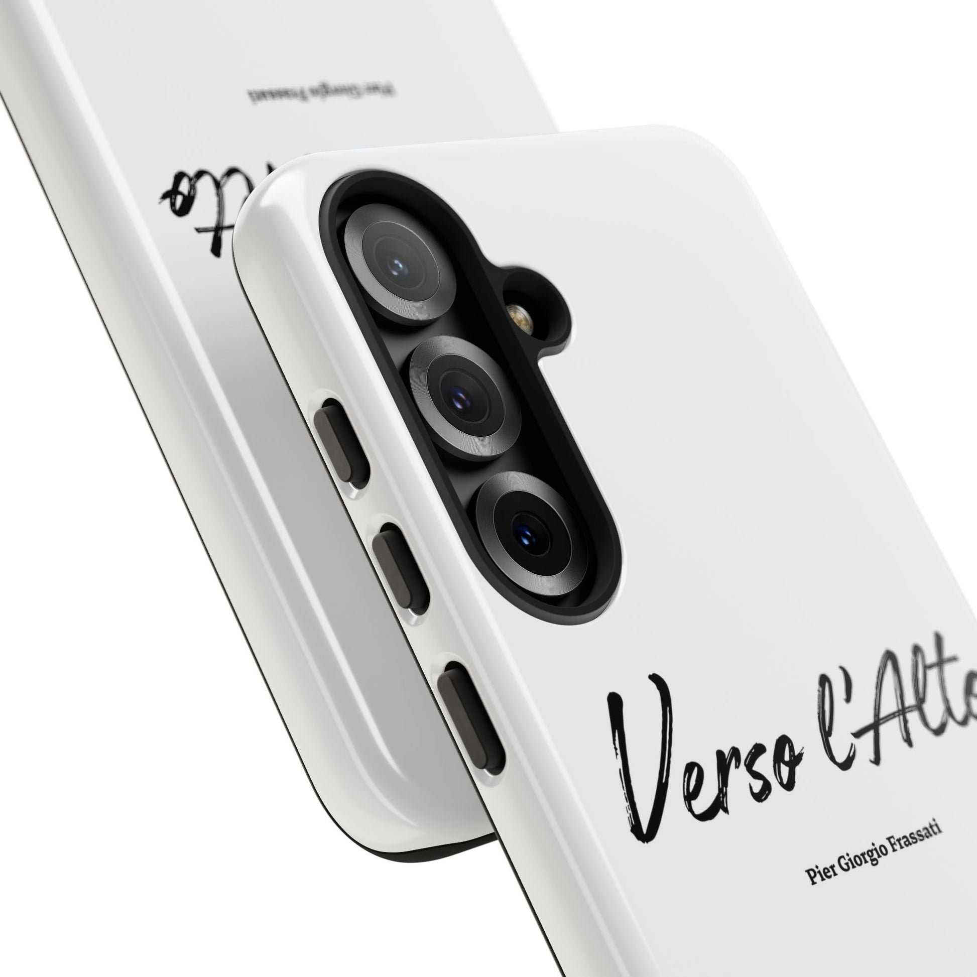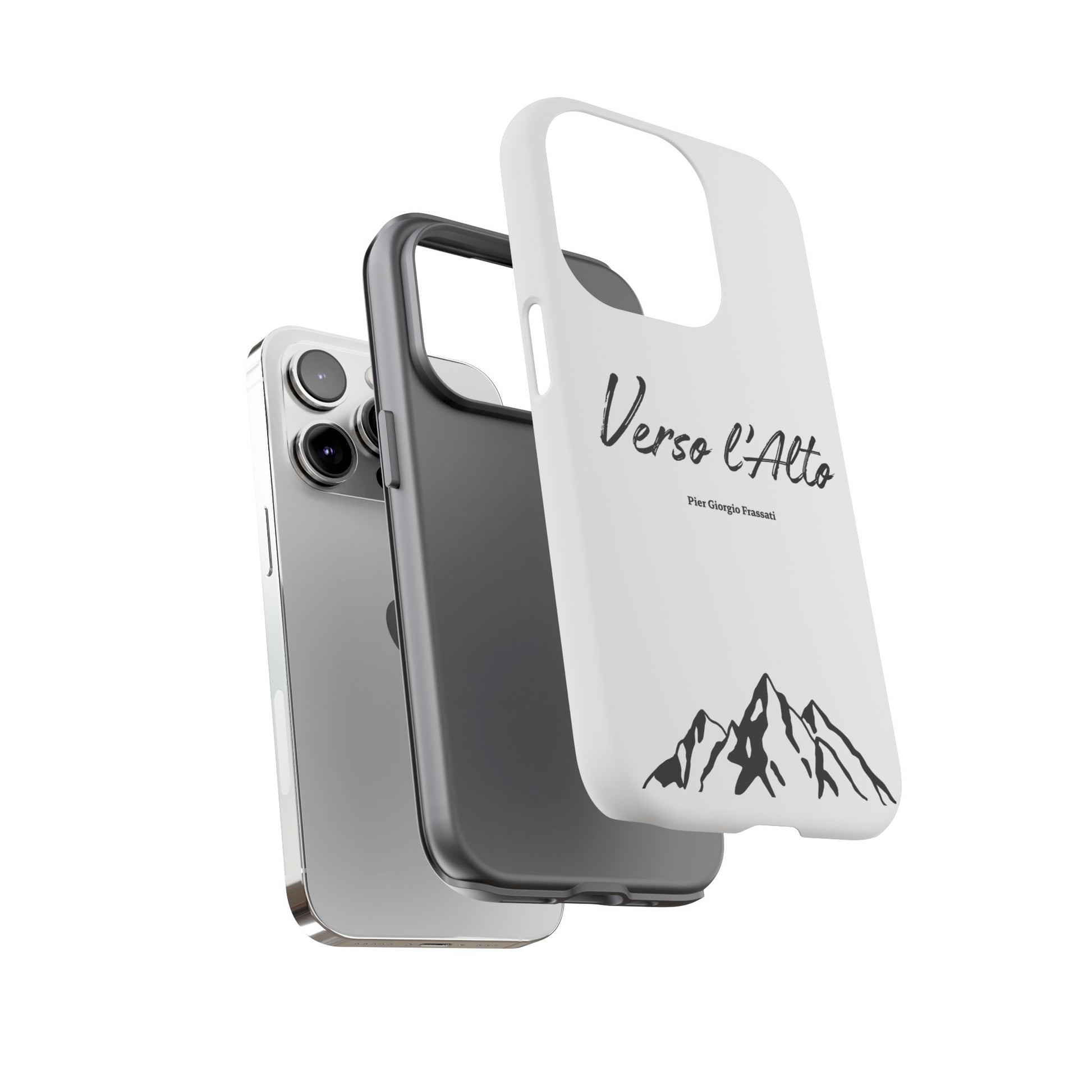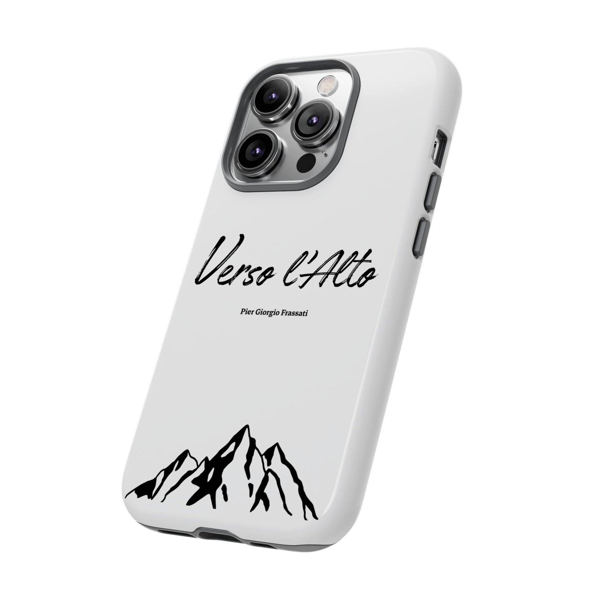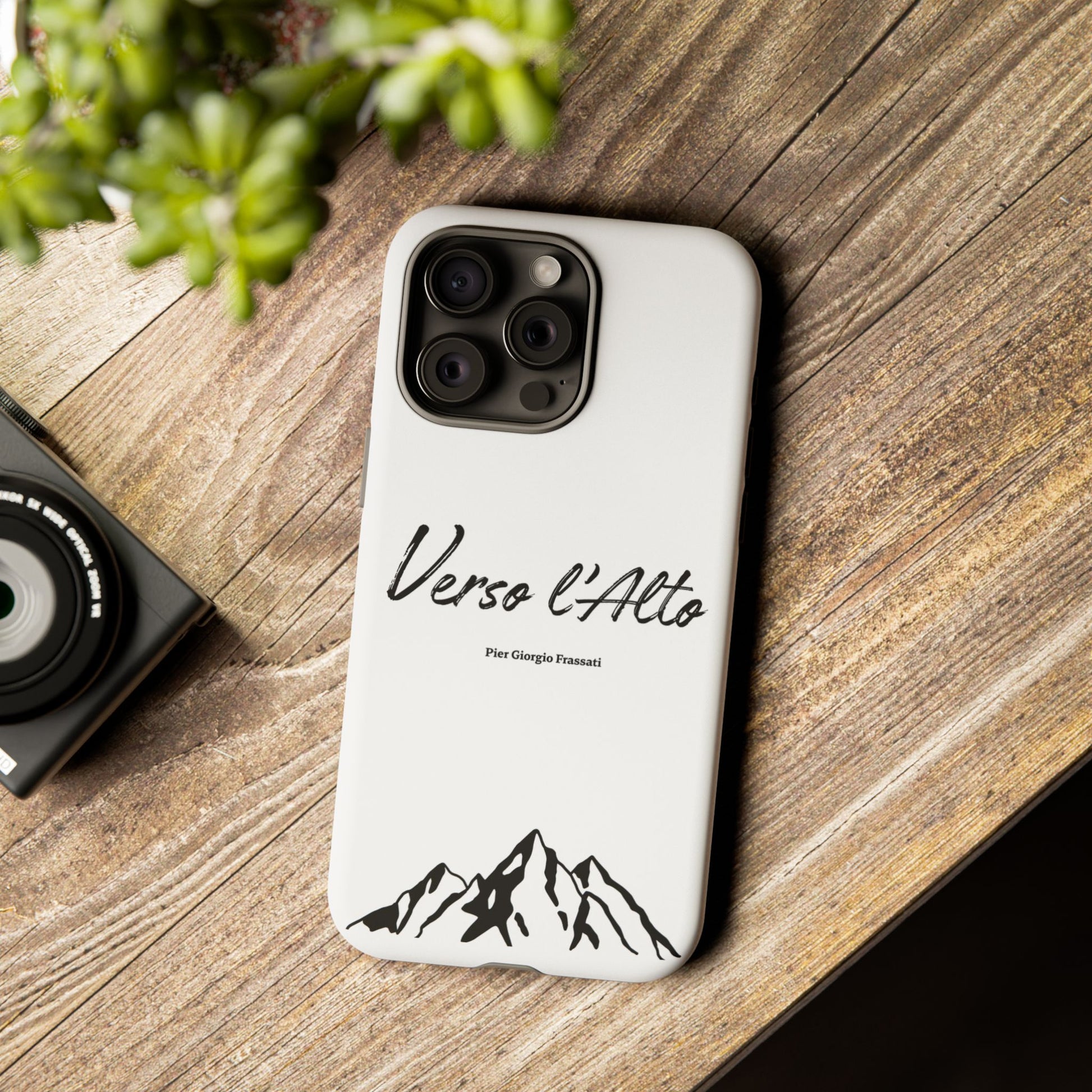 Protect your phone with elegance thanks to this case inspired by Pier Giorgio Frassati's motto, "Verso l'Alto" (To the Heights). Adorned with a beautiful mountain design and this emblematic quote from the saint Italian mountaineer, this case combines robust protection with spiritual inspiration.