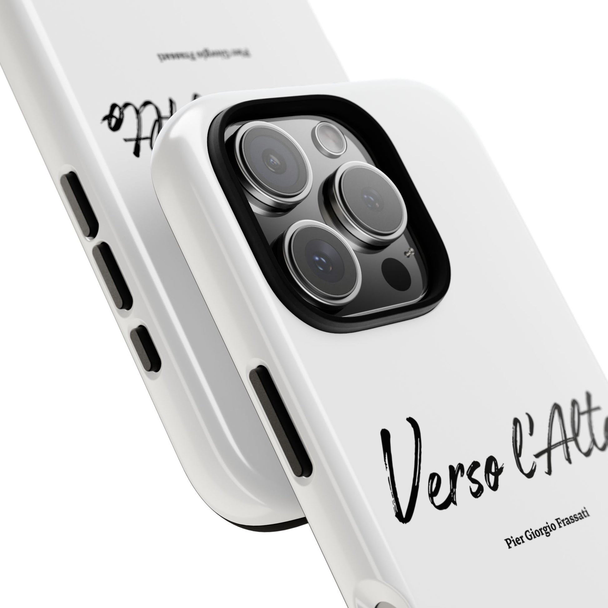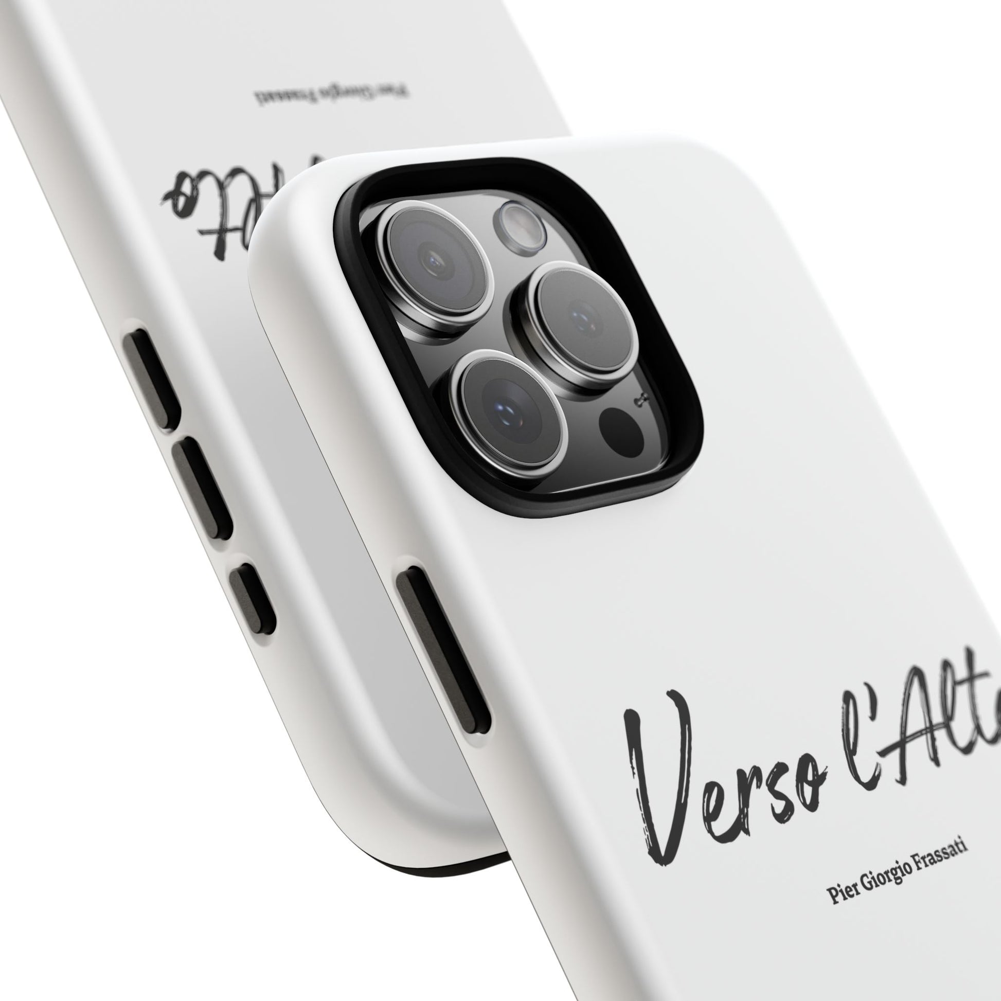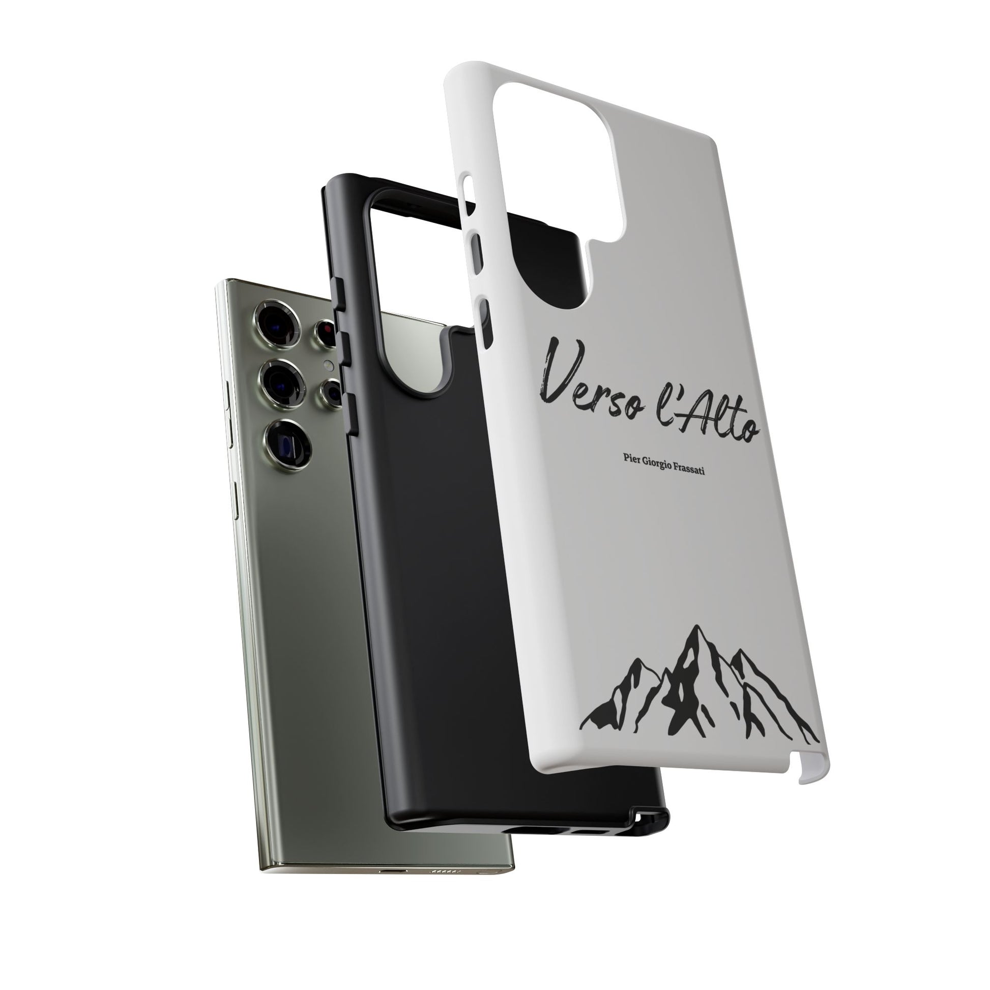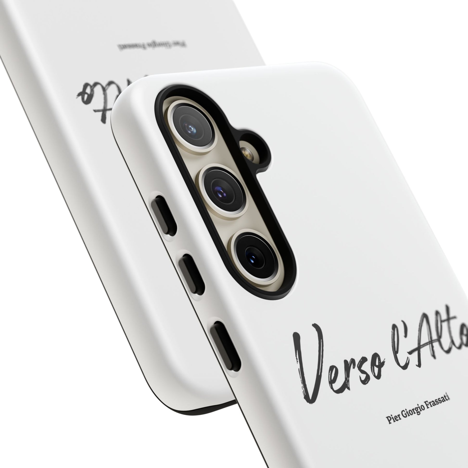 Protect your phone with elegance thanks to this case inspired by Pier Giorgio Frassati's motto, "Verso l'Alto" (To the Heights). Adorned with a beautiful mountain design and this emblematic quote from the saint Italian mountaineer, this case combines robust protection with spiritual inspiration.